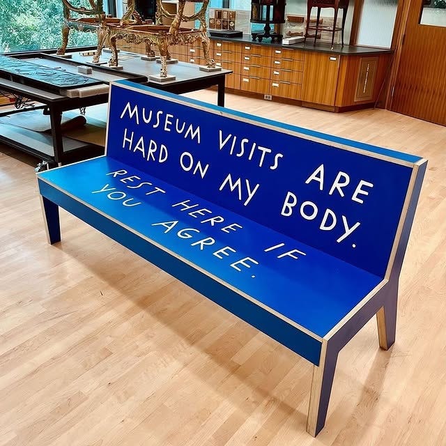 “The benches are a direct address to those who need them. A reminder of how ableist and unwelcoming to disabled and aging people art spaces can be”3